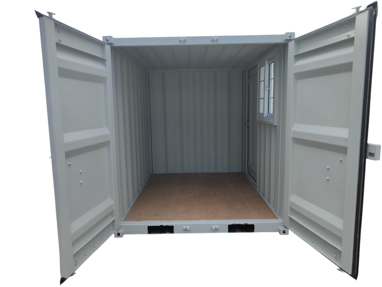 The container doors open wide, over 270 degrees
